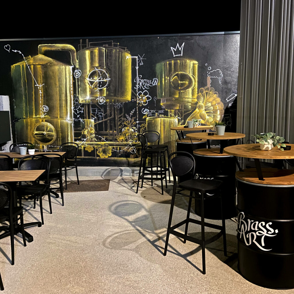Réalisation d’une peinture murale ‘Brass’ Art’ : pour une nouvelle brasserie à Velaux, près d’Aix-en-Provence. Un signal fort depuis la rue.